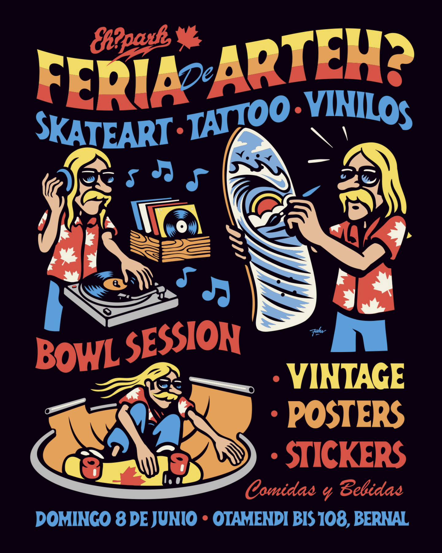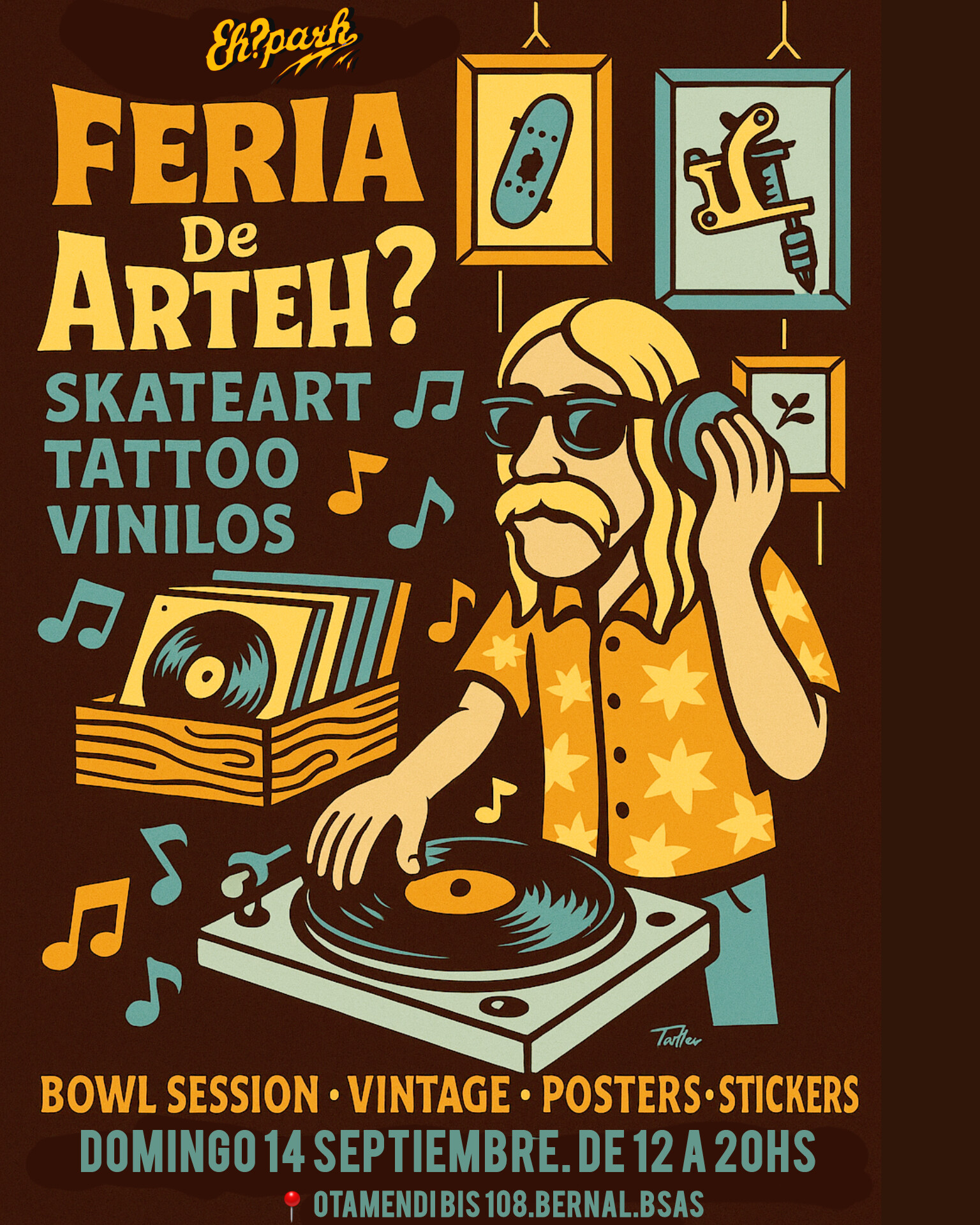 📢 FERIA De ARTEH? Vol. 2 👉 Domingo 14 de Septiembre 12 a 19hs. 📍Eh?park: Otamendi Bis 108 Bernal. Bs As. Argentina. 💿 Vinilos Cds, Casettes, Vhs. 🎨 Arte Skater y Urbano. 🖼 Laminas/Posters, Cuadros. 🧩 Stickers/Parches 🐉Tatuadores. 🛹 Skate 80’ 90’ 👕 Ropa y accesorios de autor. 📢 Convocatoria Abierta! (...) [+]
